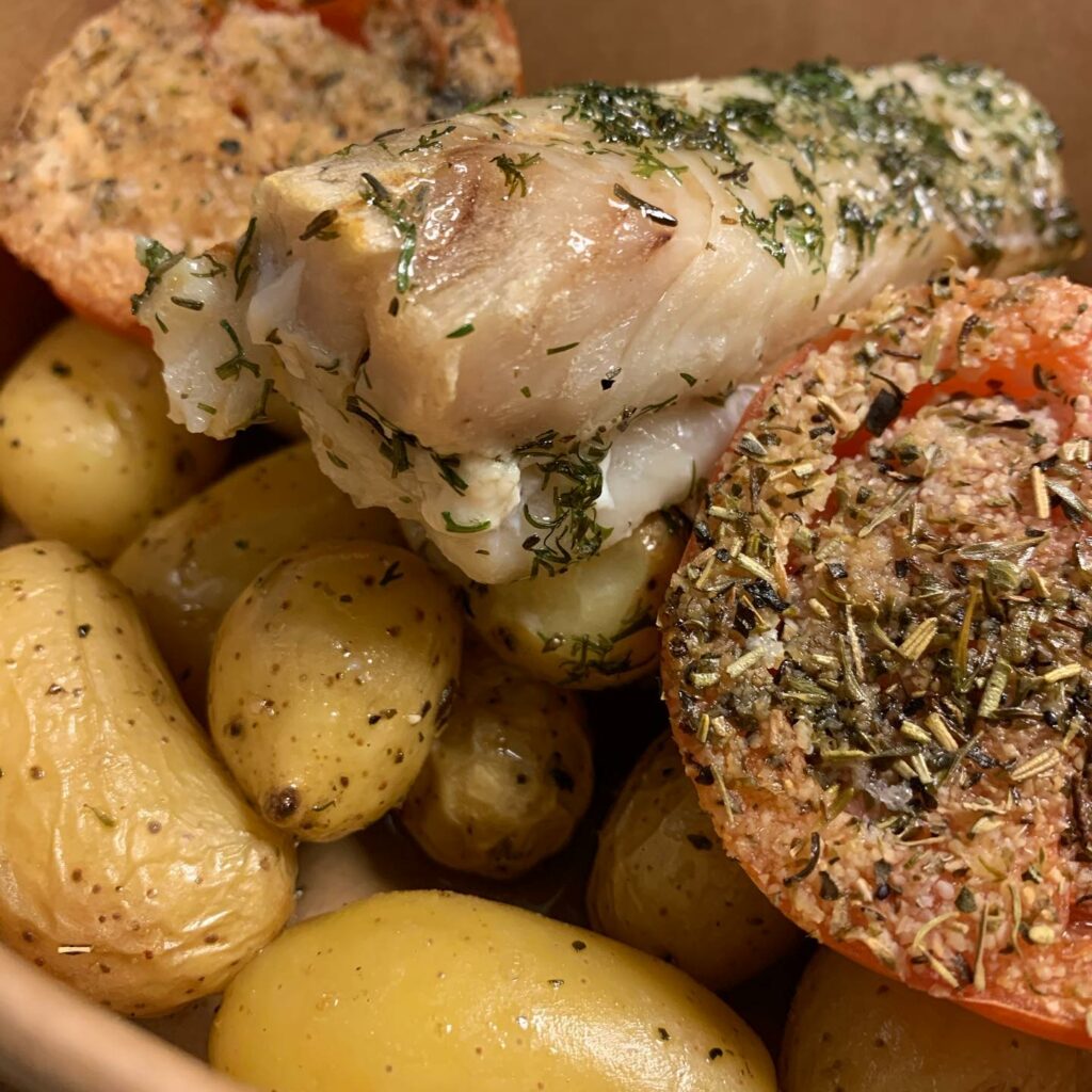 Pavé de saumon à la plancha, huile citronnée. Servi avec frites et salade au légumes de la semaine.